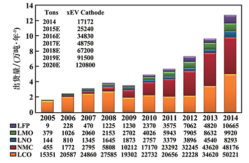 圖1 2005-2014年全球正極材料出貨量(EVTank統(tǒng)計(jì))